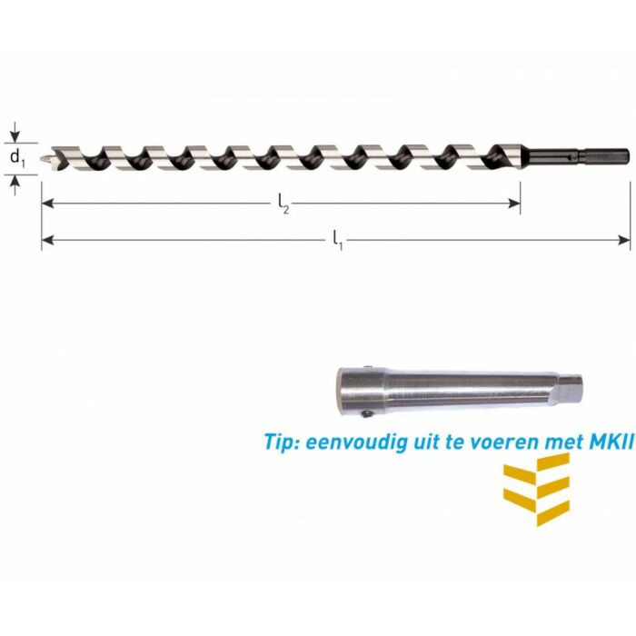 Een Azobé slangenboor heeft een wijdere spiraal dan de gewone slangenboor. De boor heeft een speciale Titanium coating, dit betekend dat de boor een hoge hittebestendigheid heeft, maar ook een lange levensduur. De slangenboor heeft een zeskant aansluiting, dit zorgt voor een goede grip.