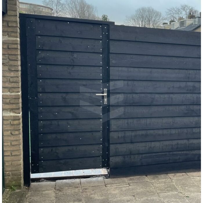 Deze rechtsdraaiende Bevelsiding deur is gemaakt op een stalen poortframe en geschroefd met zwarte RVS schroeven. Het Zweeds Rabat is twee keer zwart gespoten om de deur lang mooi te houden.